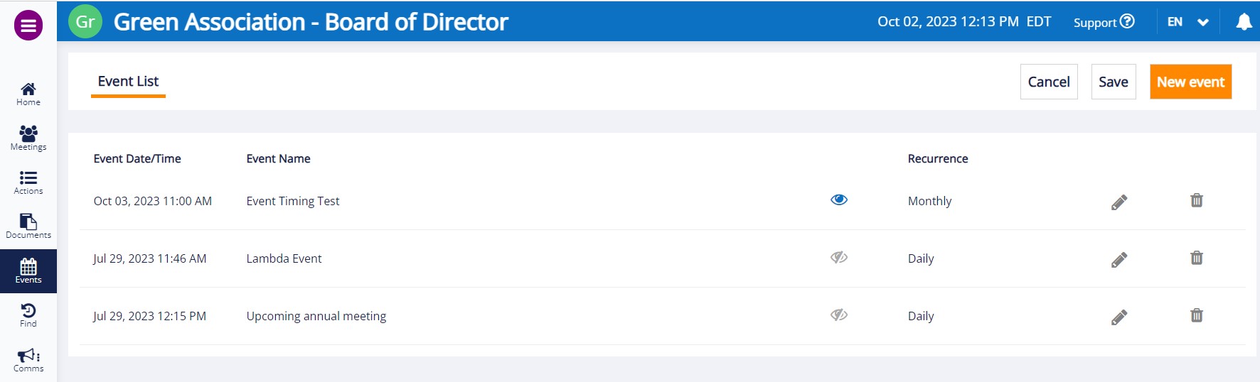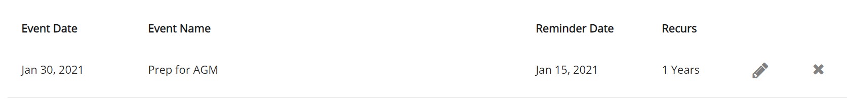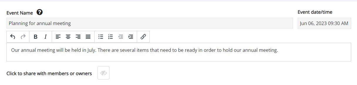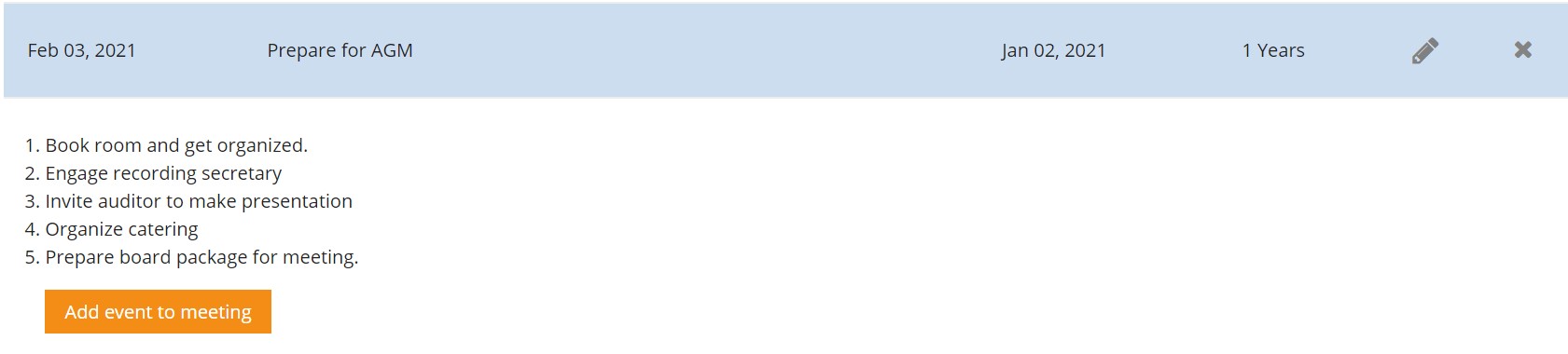 Examples of events include contract renewals, annual meeting preparation, preparation of budgets, and any event or activity of importance to the board.
