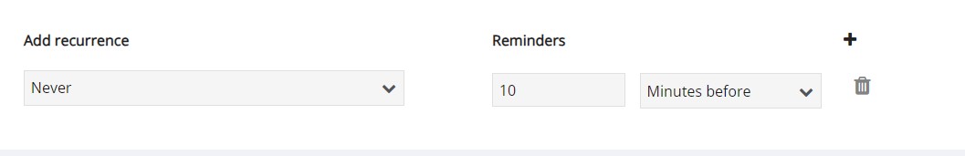 If you would like email reminders to be sent about an event, add them by clicking on the +. If no reminders are selected, no reminders will be sent but upcoming events (maximum of 5 at one time) will be listed in the overview - or board home page.